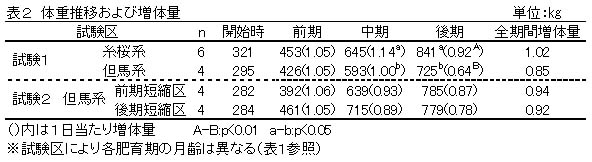 交雑種肥育は父系統の影響が大きく、糸桜系は但馬系よりTDN摂取量および増体量が多く、枝肉重量およびバラの厚さも優れる(図1、表2、表3)。