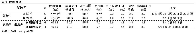 但馬系は糸桜系に比べビタミンA製剤無添加の飼料を給与する中期を2ヶ月程度長くし、血中ビタミンA量を適正に制御することで脂肪交雑が向上する(図2、表3)。