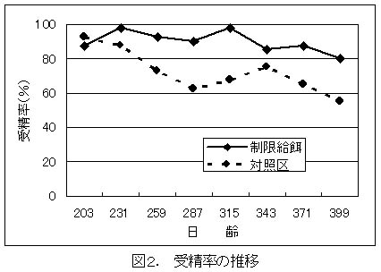 受精率は、対照区が256日齢以降60〜70%台に低下するのに比べて、制限区はほぼ全期間80%以上を維持する(図2)。