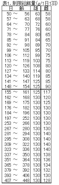 50〜154日齢までは雌雄別飼育により、155日齢からは雌雄別給餌により、雄に対する制限給餌を行う(表1)。