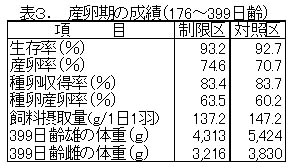 154日齢まで制限給餌した後自由摂取とした対照区に比べて制限区では、399日齢の体重が雄1.1kg、雌600g小さくなり、176〜399日齢時の産卵率は約4%良くなる(表3)。また、176〜399日齢の雄を含む全群の飼料摂取量は1日1羽当たり10g少なくなる。