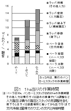 ベーラの作業能率は、1台のトラクタにハーベスタとベーラの2台の作業機を装着したワンマン作業体系で184分/ha(10.1t/hr)、対応ラッパの能率は253分/ha(7.4t/hr)でありラッパの密封作業がより多くの時間を必要とする。また、延べ作業時間は慣行のバンカーサイロの約60%、スタックサイロの約50%に短縮できる(図1)。
