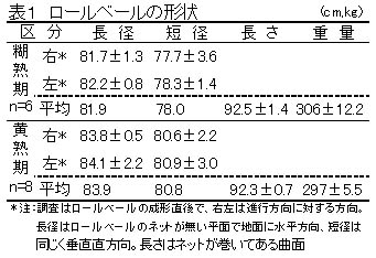 成形されるロールベールは直径約80cm、長さ約90cm、重量約300kg、体積約0.5m3で、密度は約650kg/m3である(表1)。