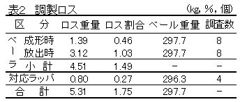 ベーラの調製ロスは成形時ロス0.5%、放出時ロス1.0%で、対応ラッパの密封ロスは0.26%であり、合計のロスは約1.8%になる(表2)。