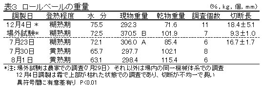 トウモロコシの登熟が進むとロールベールの現物重量は軽くなるが乾物重量は重くなる傾向を示す。さらに、糊熟期の調査結果(水分72%)から切断長が短い方が重いことから、短く細断した方が密度も高まる(表3)。