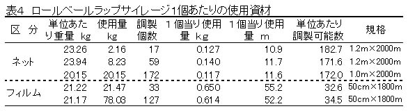 表4 ロールベールラップサイレージ1個あたりの使用資材