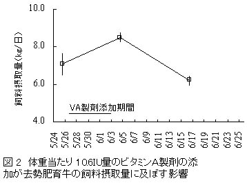 図2 体重当たり10.6IU量のビタミンA製剤の添加が去勢肥育牛の飼料摂取量に及ぼす影響