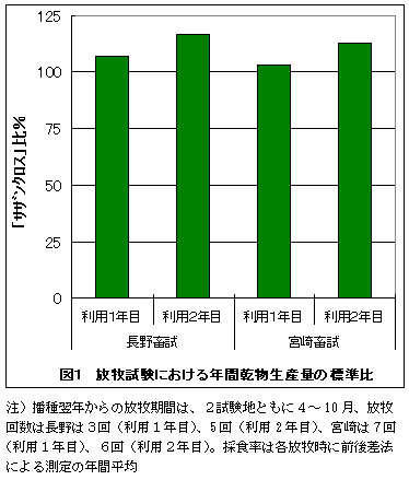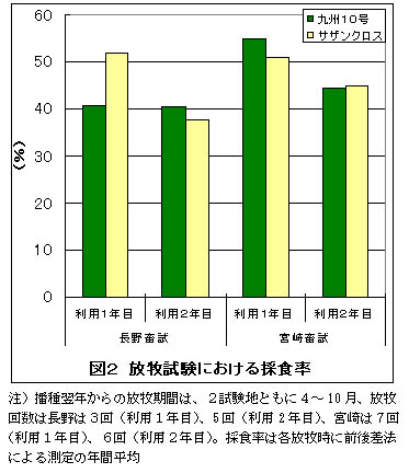 放牧条件における現存量は「サザンクロス」より高く維持され(図1)、採食率は「サザンクロス」並である(図2)。