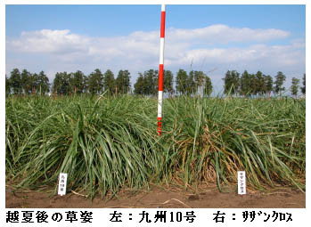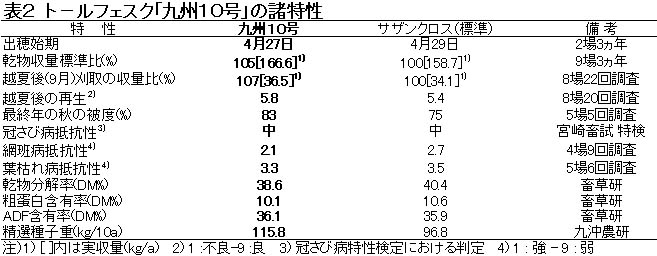 - トールフェスク「九州10号」は、永続性、収量性に優れる中生品種である。九州から東北中部までの広範囲の地域に適応し、特に暖地の放牧草地等における永年的な高品質牧草生産に貢献できる。