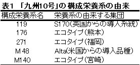 九州のエコタイプ3、外国品種2を構成栄養系とする合成品種である(表1)。