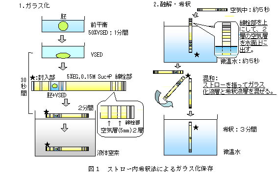 50%VSEDで前平衡後の性判別胚をガラス化液(VSED)に浸漬後、2層の空気層を挟んだ希釈液と共に0.25ml容のストローに封入し、液体窒素内でガラス化する。融解は、液体窒素から取り出したストローを2層の空気層を残すように微温水に投入(約5秒)して行う。その後、微温水中から取り出したストローを反転させ、綿栓部を下にして、ストローを振ることによってガラス化液層と希釈液層を混和させ、再度ストローを3分間微温水内で静置し希釈を行う(図1)。これにより、綿栓部側に空気層を1層残すことが可能となる。