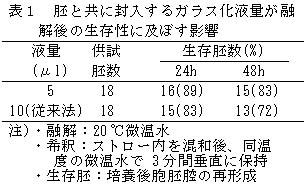 表1 胚と共に封入するガラス化液量が融解後の生存性に及ぼす影響