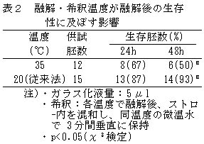 表2 融解・希釈温度が融解後の生存性に及ぼす影響