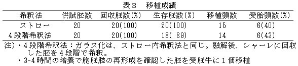 ストロー内で希釈した胚の融解後の生存率と移植後の受胎率は、従来の4段階希釈法と同等である(表3)。