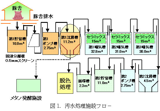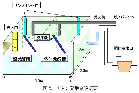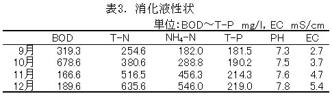 - 家畜尿汚水処理過程において、沈殿処理で排出される沈殿汚泥は、pH7.5〜7.7と中性であるが、C/N比4.0〜5.5とメタン発酵を行うには低い条件化である。しかし、滞留日数60日で発酵処理を行うことで、発酵槽内の水温が平均摂氏20度と低い条件下においても、生成される消化液はBOD等の顕著な成分減少が確認される。