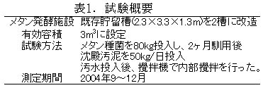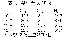試験期間中のメタンガス濃度は水温の低下とともに減少し、平均ガス量が投入汚泥乾物1kg当たり67Lと少ないため、メタンガス濃度、量を確保するためには、ヒーター等による加温により水温を上昇させ、汚水投入量を増やし高負荷条件にすることが必要となる(表5)。