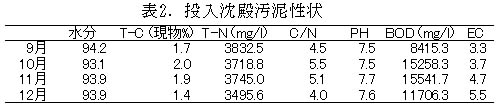 沈殿汚泥はpH7.5〜7.7と中性であるが、C/N比4.0〜5.5とメタン発酵を行う条件としては低濃度である(表2)。