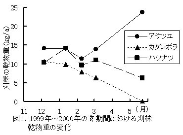図1 1999〜2000年の冬期間における刈株乾物重の変化