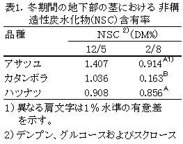 表1 冬期間の地下部の茎における非構造性炭水化物(NSC)含有率