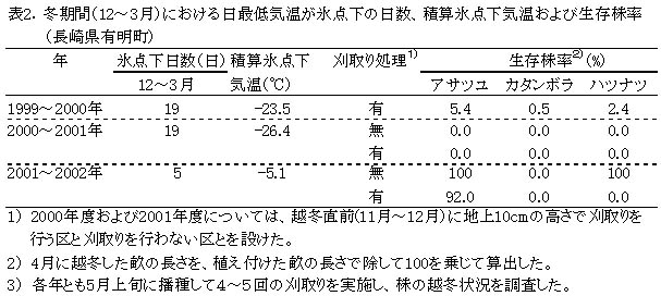 表2 冬期間(12〜3月)における日最低気温が氷点下の日数、積算氷点下気温及び生存株率
