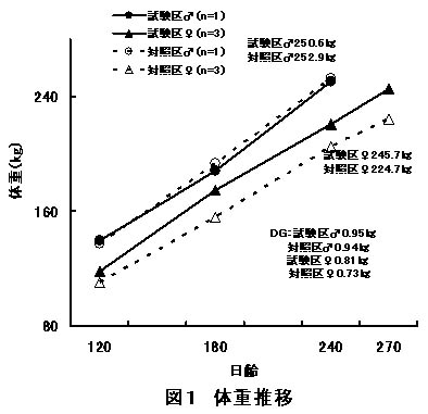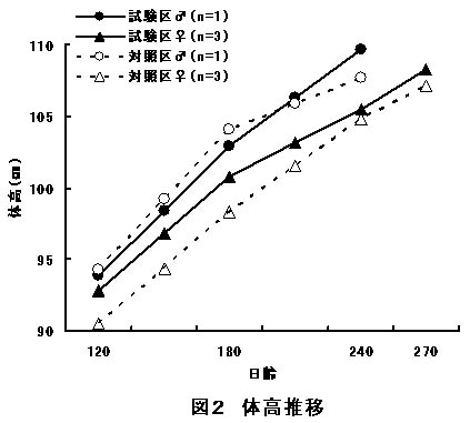 体高の推移は、両区に有意な差は見られず、良好な発育を示す(図2)。