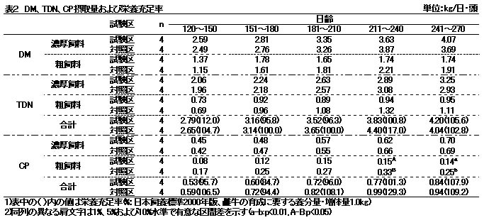表2 DM、TDN、CP摂取量及び栄養充足率
