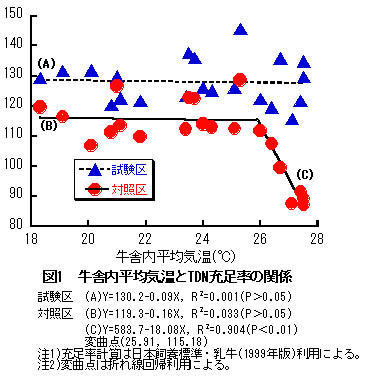 図1 牛舎内平均気温とTDN充足率の関係