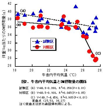図2 牛舎内平均気温とDM摂取量の関係