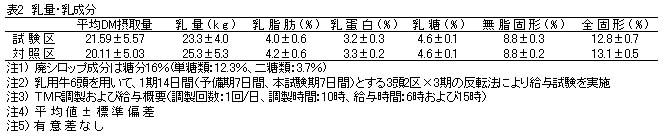 試験期間中の乾物摂取量、乳量、乳成分に差は認められなかった(表2)。