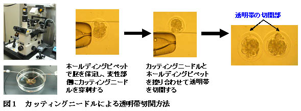 - ウシ低ランク胚の新鮮移植において、マイクロマニピュレーターを用いホールディングピペットとカッティングニードルにより容易に透明帯切開ができ、透明帯切開により受胎率が向上する。
