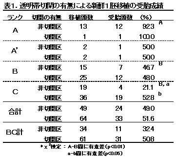表1 透明帯切開の有無による新鮮1胚移植の受胎成績