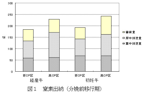 分娩前移行期における尿中窒素排泄量および窒素蓄積量は、経産牛・初妊牛とも高CP区で有意に高くなる。特に、経産牛では窒素蓄積量より尿中窒素排泄量が増加し、初妊牛では尿中窒素排泄量より窒素蓄積量が増加する傾向にある。(図1)