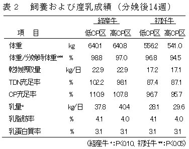 平均日乳量は、経産牛・初妊牛とも高CP区で高く推移するが、泌乳期の体重回復は高CP区で遅れる傾向にある。(表2)