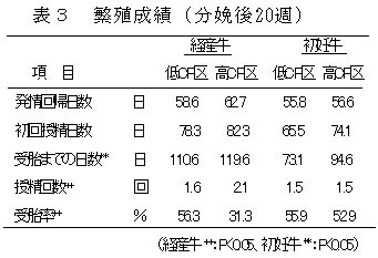 繁殖成績は、経産牛では受胎率、授精回数において低CP区で良好であり、初妊牛では高CPで受胎までの日数が延びる傾向にあるものの受胎率に差はみられない。(表3)