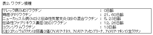 衛生対策面の強化としては、鶏舎消毒(表1)とコクシジウムワクチンを加味したワクチン接種(表2)および、その他の衛生対策(表3)を行う。飼料は4週齢まで抗菌性飼料添加物を含まないブロイラー前期飼料を、その後、出荷まではブロイラー仕上げ飼料(無薬)を給与する。