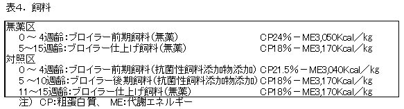 慣用飼育マニュアルに従った飼料を給与する対照区に比べて、餌付けより全期間、無薬飼料を給与する無薬区の飼育成績は、全く差がみられない(表4、表5)。