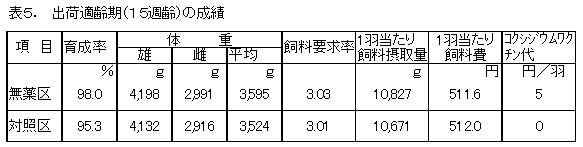 1羽当たりの飼料費は無薬区と対照区で差はなく、無薬区では、コクシジウムワクチン代として1羽当たり5円の経費上昇となる(表5)。