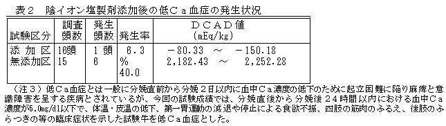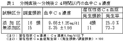 陰イオン塩製剤添加後の低Ca血症は、無添加区6頭(40.0%)、添加区1頭(6.3%)である(表2)。