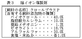 陰イオン塩製剤は表3に示す「イオンバランス調整剤(クロールプラスP)」を使用し、1日1頭当たり400〜500gを添加する(表3)。