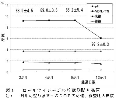 乳熟期のトウモロコシのロールベールラップサイレージは貯蔵期間が延びるに伴い乳酸含量は低下したが、V-SCOREは低下せず、品質は良好である(図1)。