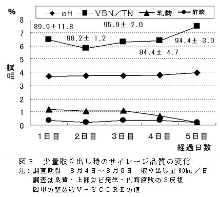 平均気温摂氏26.5度、平均最高気温30.6度の条件下でも、上部含水率70%下部含水率77%の乳熟期のロールベールラップサイレージを毎日上部から写真1のように60kgずつ取り出しても品質の劣化は小さく、4日から5日間かけて取り出すことが可能である(図3)。