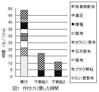 作付け作業時間では、耕起栽培は10アールあたり約50分を要するが不耕起播種は11分から17分であり3分の1以下に省力できる(図1)。