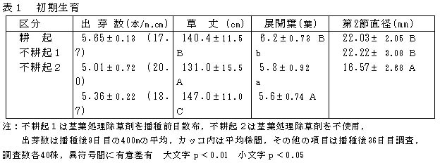初期生育については、茎葉処理除草剤を散布し雑草の少ない状態で生育した不耕起1区は茎の直径は耕起区と同じであるが草丈が低い。また、茎葉処理除草剤を散布せず雑草の多い状態の不耕起2区は雑草との競合により草丈が高く茎が細い傾向である(表1)。