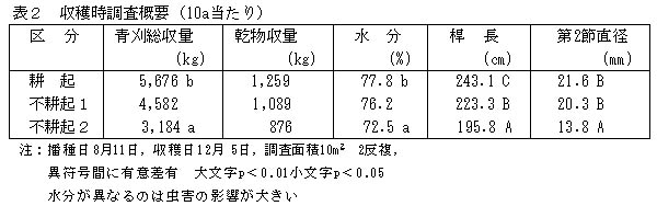 収量は耕起栽培が多い。初期に雑草の少ない不耕起1区では耕起播種の86%の乾物収量で、雑草の多い不耕起2区は同70%と更に少ない(表2)。