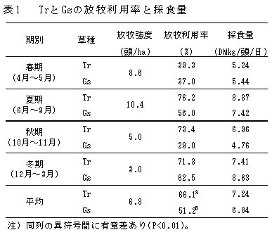 放牧利用率はTrがGsよりも有意に高く、1頭当たりの採食量(DMkg/日)もTrがGsよりも高い傾向である(表1)。