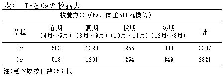 - TrとGsそれぞれ9.4aの牧区を4牧区づつ設置し,黒毛和種繁殖牛(維持水準)を用いて集約的周年放牧を実施した。また、季節別の草量にあわせて放牧頭数を増減させた。追肥は退牧毎にN,P2O5,K2Oそれぞれ5.7、3.2、4.5kg/10aを施用した。