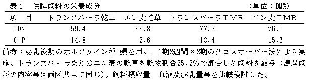 今回の結果は購入粗飼料のエン麦の代替として自給粗飼料のトランスバーラが乳用牛の混合飼料に活用できることを示唆するものであり、今後の参考資料となる。実際にトランスバーラを混合飼料として活用する場合は乾物摂取量向上のための嗜好性対策および栄養設計(特にCP含量)について留意する必要がある。