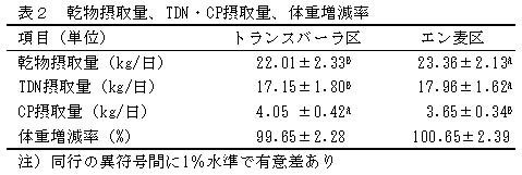 表2 乾物摂取量、TDN・CP摂取量、体重増減率