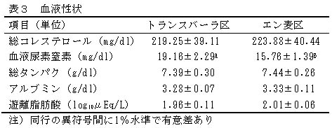 トランスバーラ区の血中総コレステロール値は219.25mg/dlであるが、エン麦区との有意差は認められない。血液尿素窒素値はトランスバーラ区で19.16mg/dlでエン麦区より有意に高い(表3)。