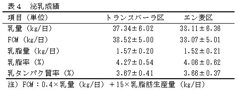 乳量はトランスバーラ区で37.34kg/日であり、エン麦区とほぼ同じである。これはFCM乳量についても同様である。乳脂率についてはトランスバーラ区が4.27%であり、エン麦区より高い傾向にあるが、有意差は認められない。乳タンパク質率についてはトランスバーラ区が3.67%でエン麦区とほぼ同じである(表4)。
